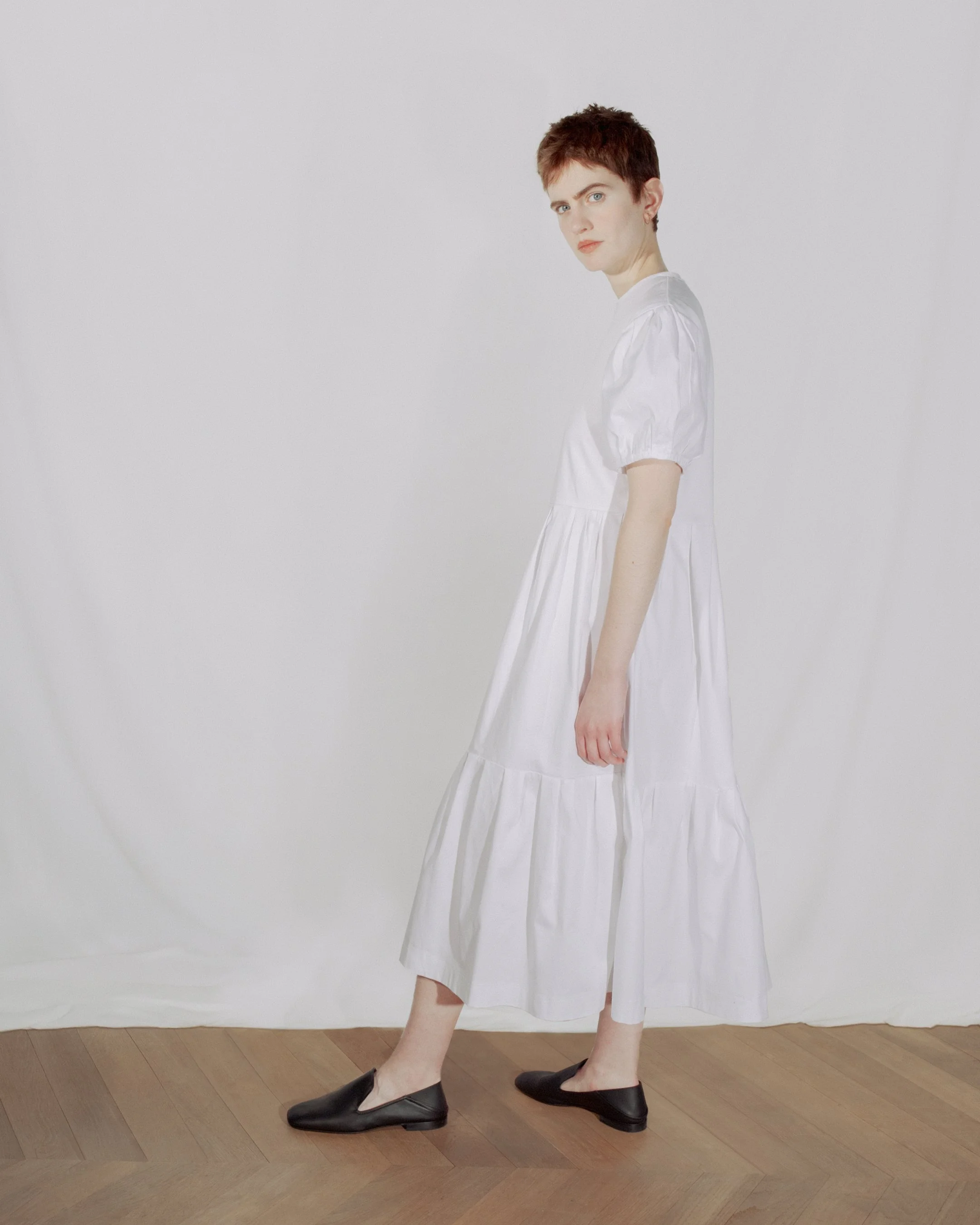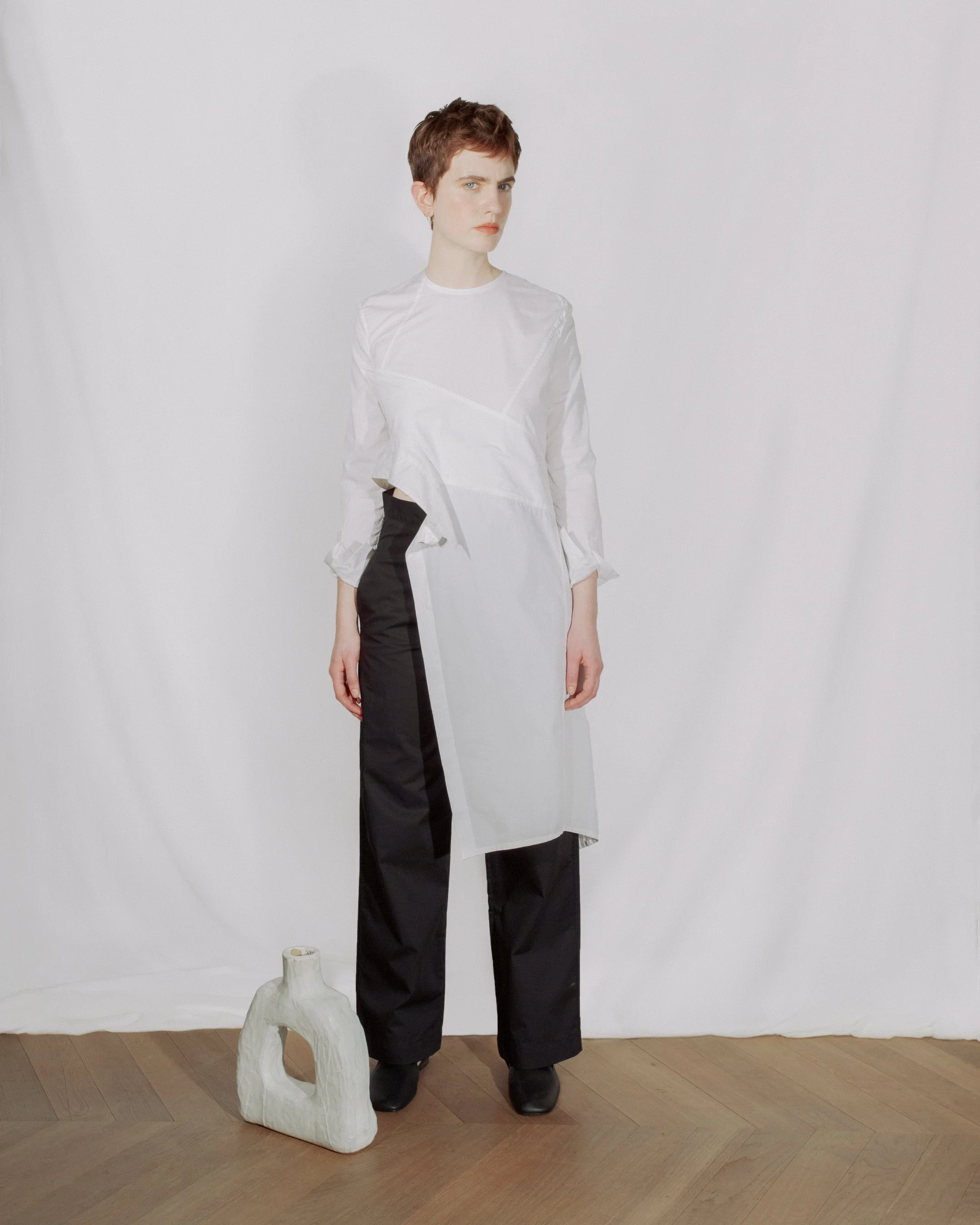 The current collection features deconstructed white shirts, elegantly draped dresses with volume, silky slip dresses, and a variety of overgarments including the 'cut out' jacket and 'scarf-coat'.